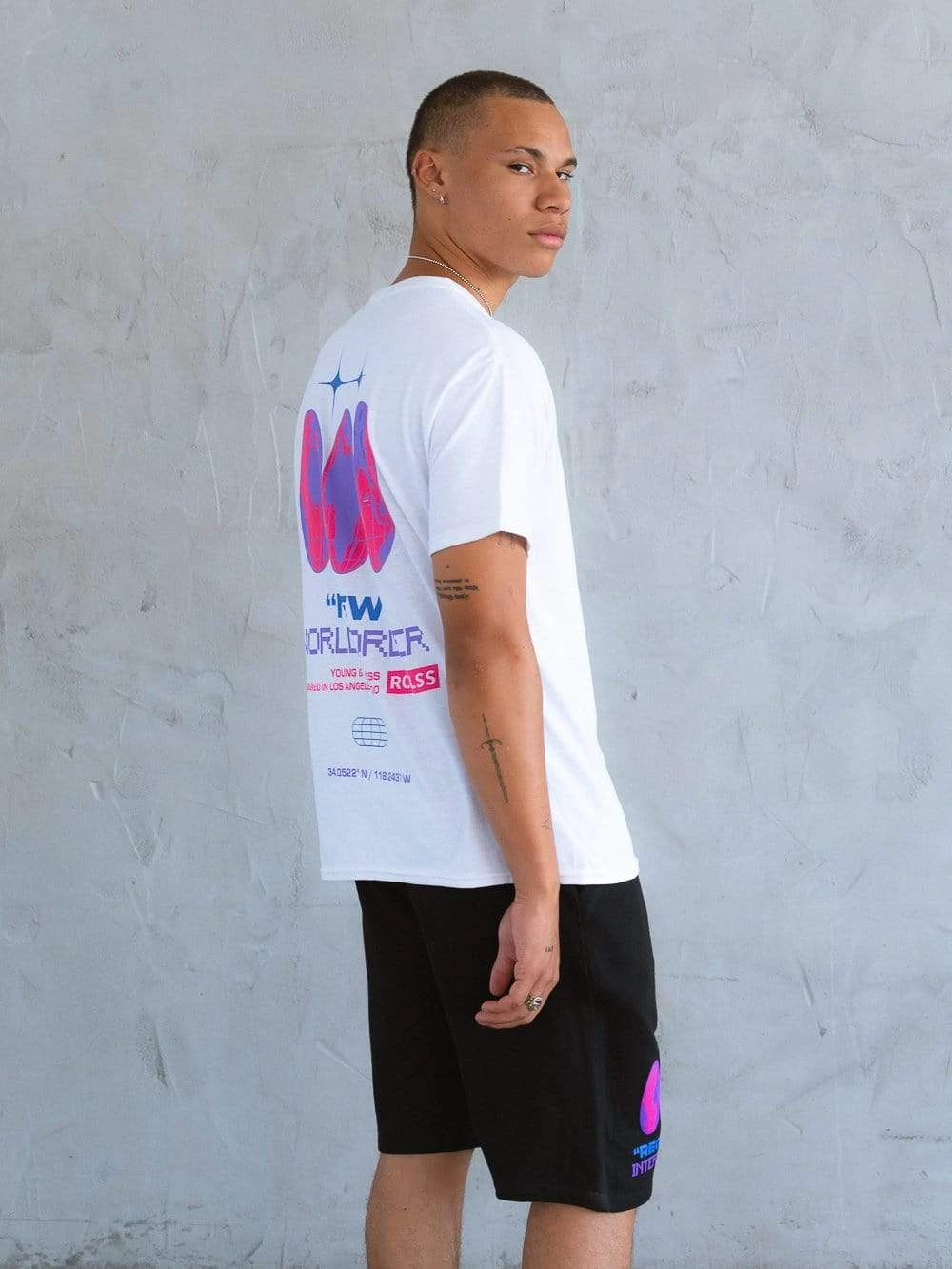 - Our Atlas Tee in white features graphics on the front and back of shirt. Cotton tee also features rib-knit banding at the crewneck, providing a comfortable fit for all.