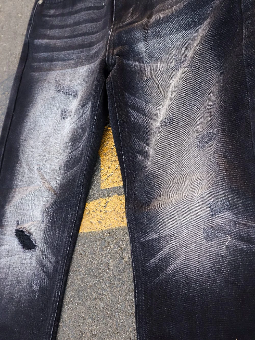 - Introducing our Carter Denim in Black. Straight leg faded denim with distressing to give it just the right worn in look. Throw these on with your favorite kicks and you’re good to go. Easy style, zero overthinking. This item is Final Sale. ESTIMATED SHIP DATE IS 4-6 WEEKS FROM ORDER DATE.