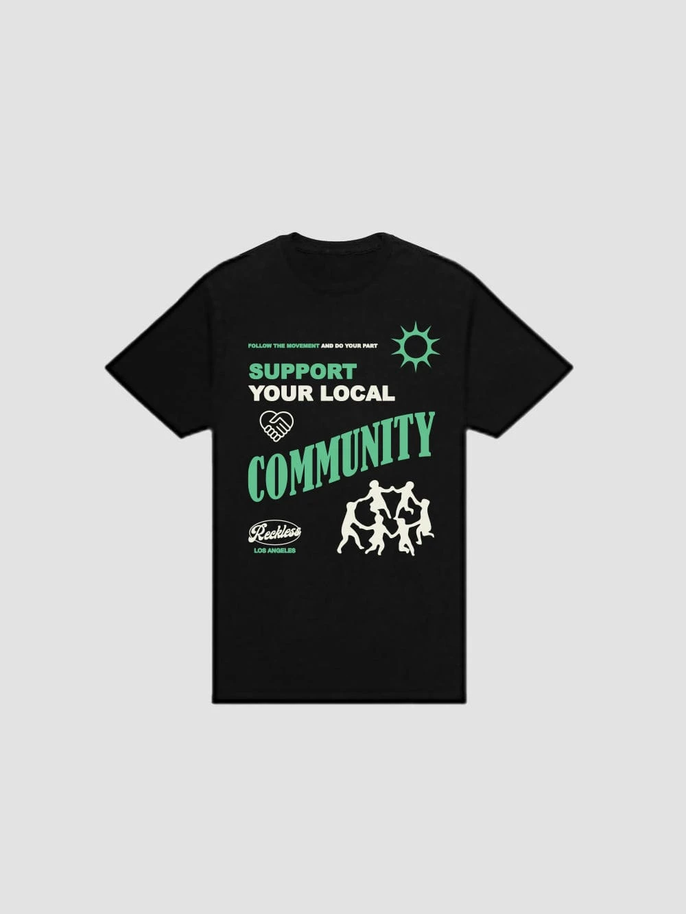 - Community Tee features our Reckless logo and large graphic on the front. Tee is cut to a standard fit, and is topped with a rib-knit crew neck.