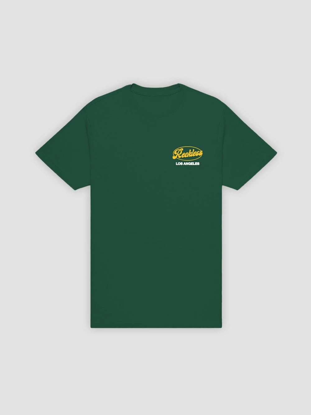- Our District Tee in Forest Green features our RECKLESS logo on the front and back. T-shirt is short sleeved, and is cut to a standard fit.