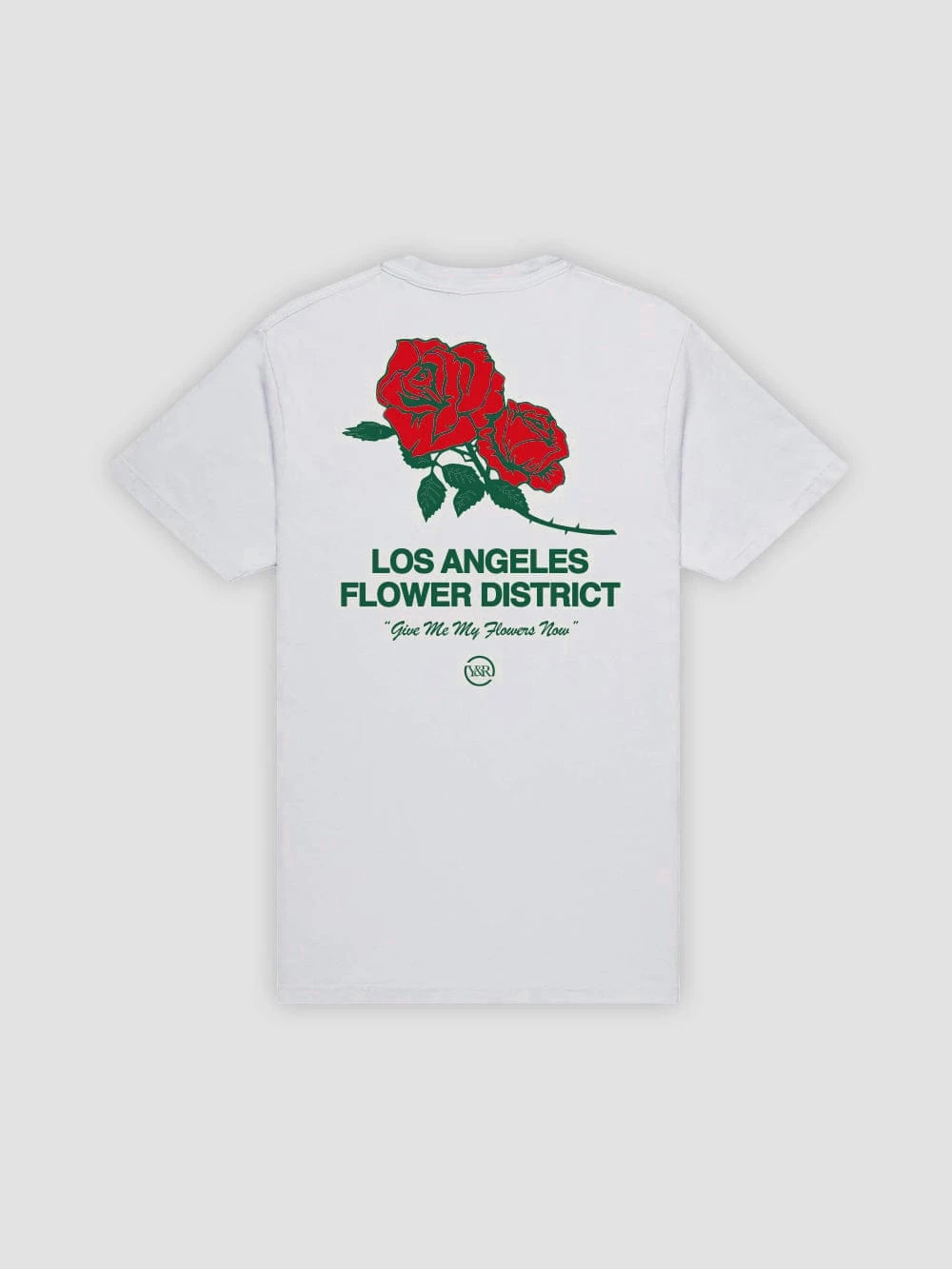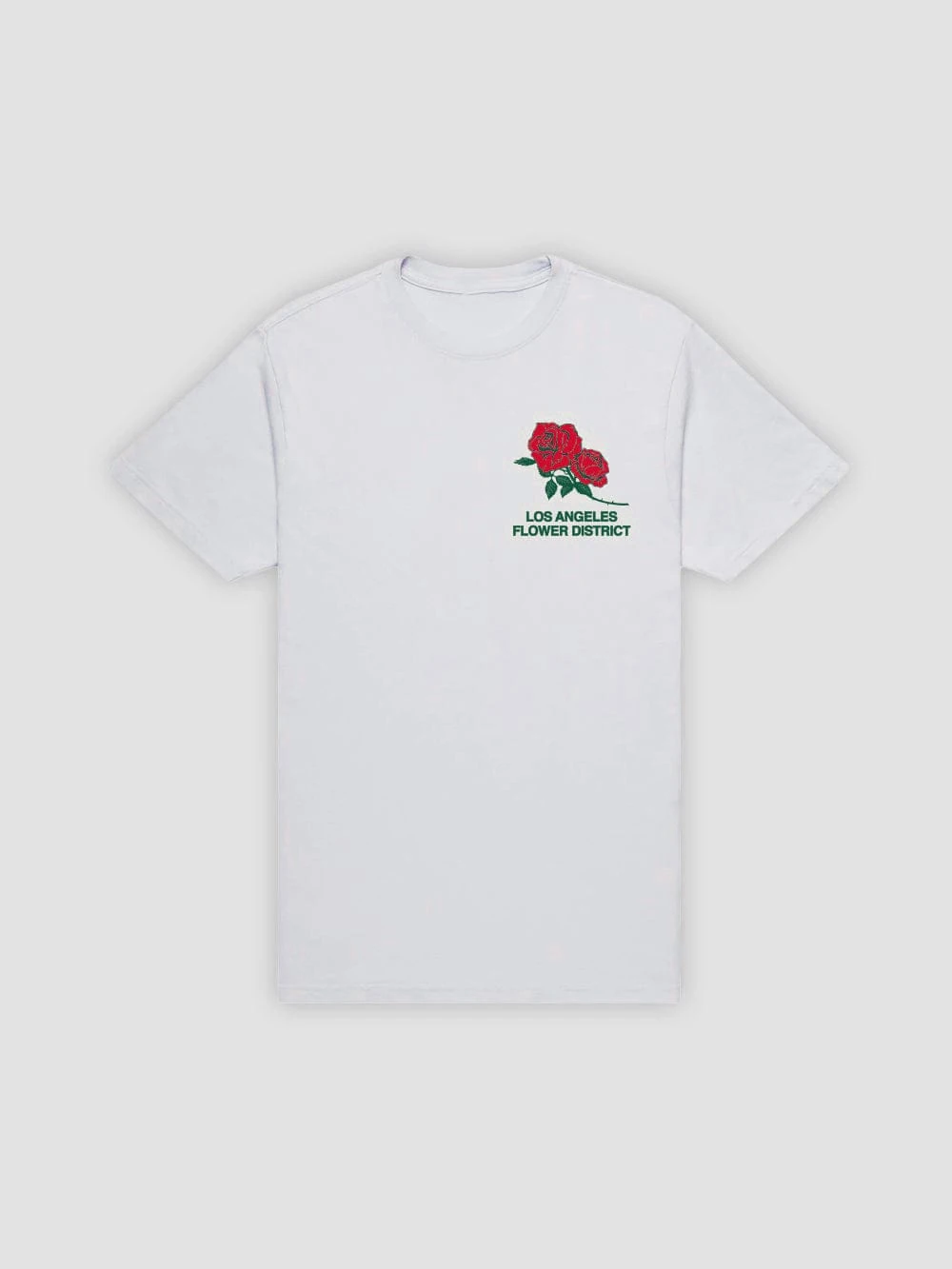 - The Flower District Tee is short sleeved, cut to a standard fit, and topped with a rib-knit crew neck. Large graphic on back, small graphic on front.