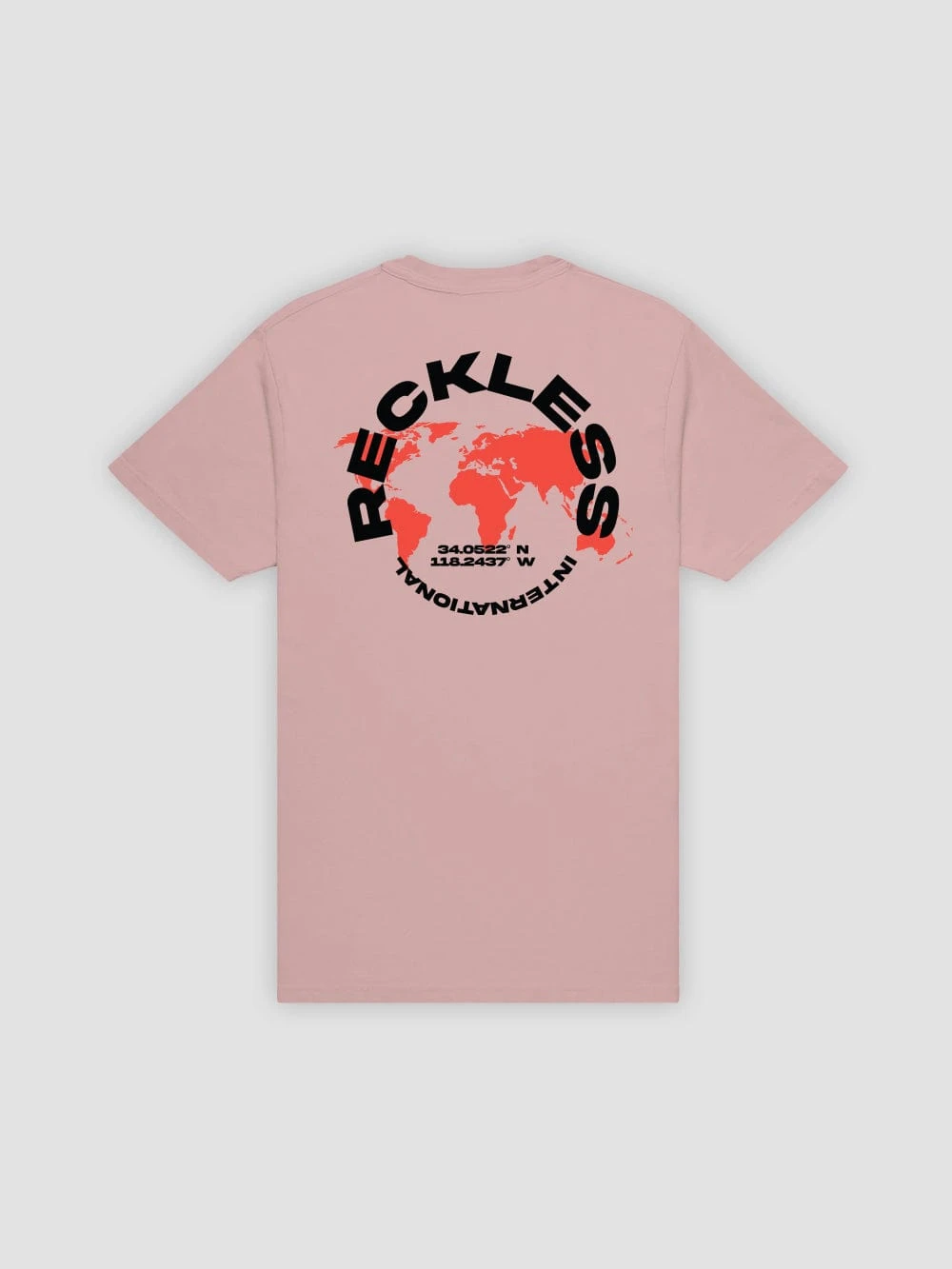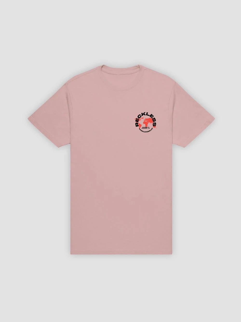 Introducing our Globe Tee in Light Pink. Tee features our RECKLESS logo on the front and large graphic across the back.