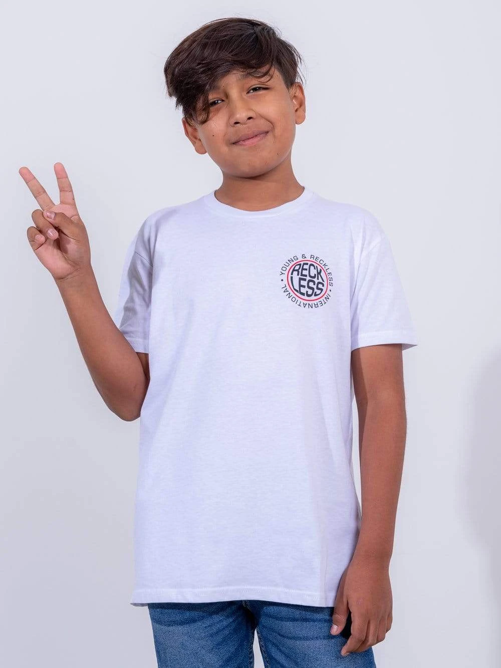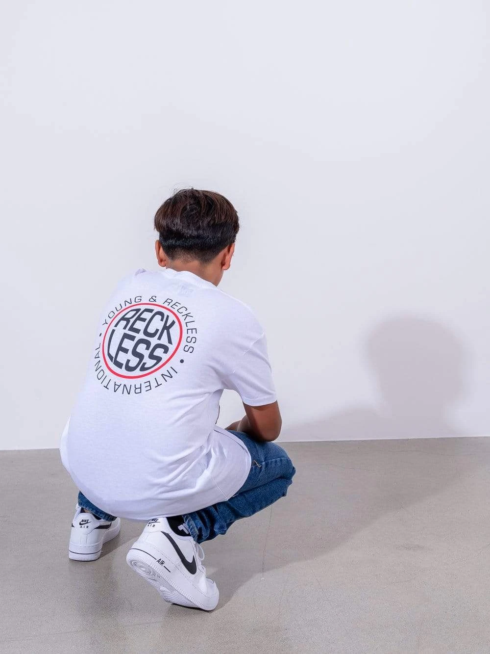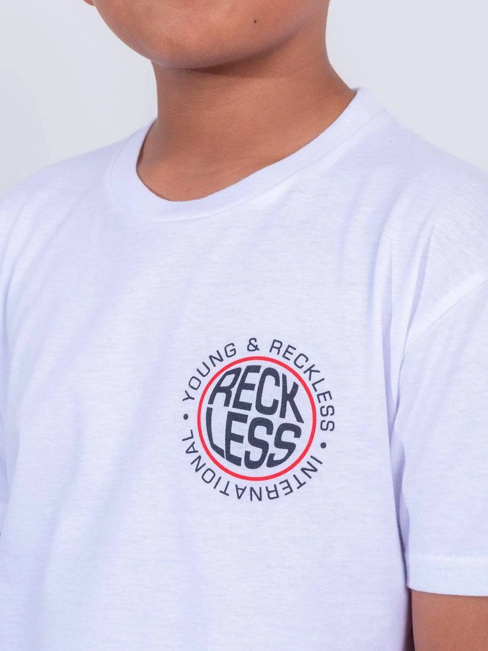 - Introducing our Inflate Tee! White tee is a standard cut, relaxed fit short sleeve tee, and is finished with a small RECKLESS logo on the front left chest and a large screen print graphic on the back.