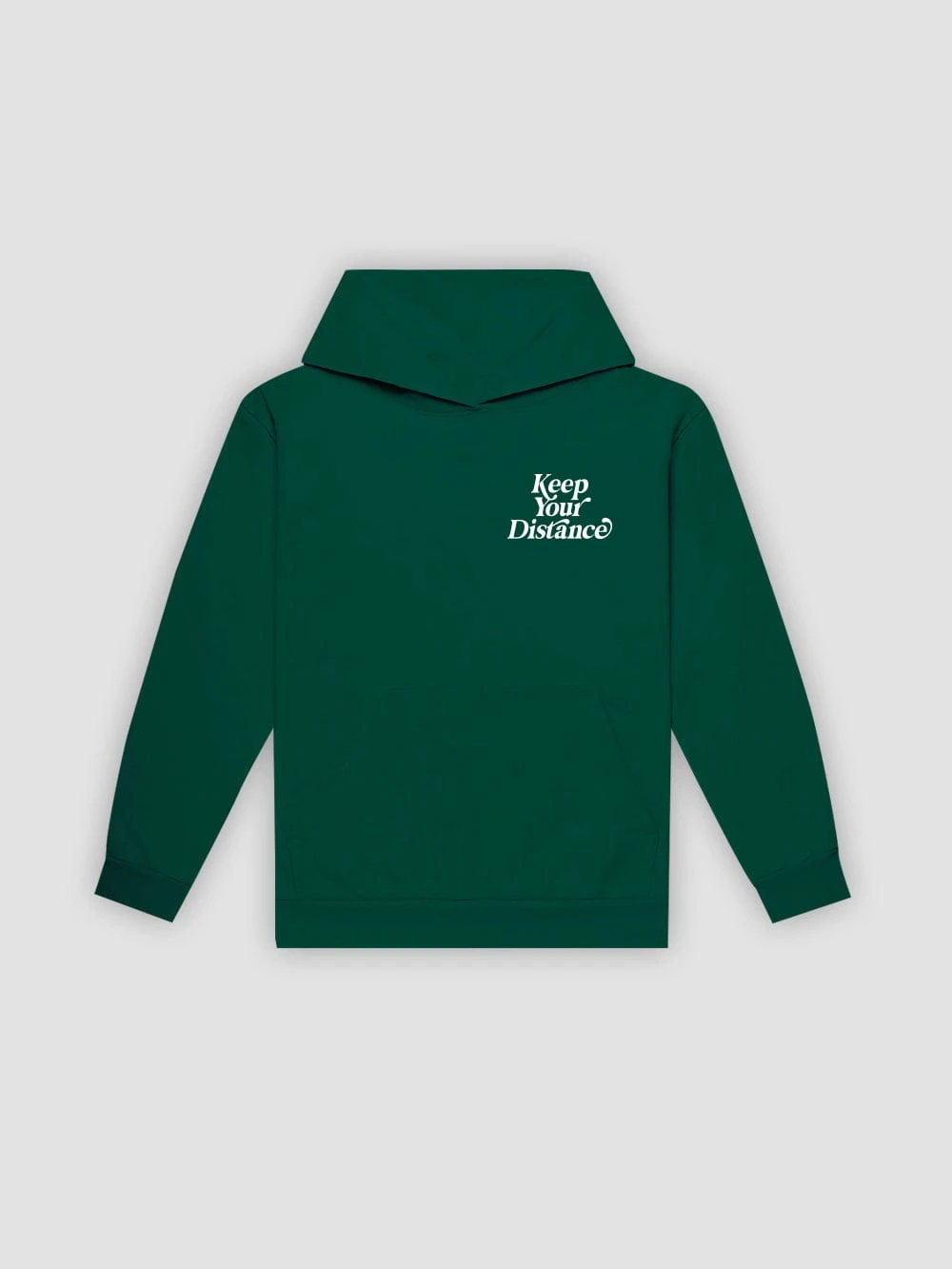- Friendly reminder to please keep your distance. Forrest Green hoodie is designed with 3D puff print text on the front and back. Rib-knit banding at the cuffs and hem provides a snug and secure fit. Hoodie is also laced with an adjustable hood and a large front pocket..