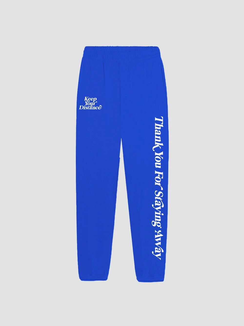 - Introducing our Keep Your Distance Sweatpants in Royal Blue. Sweats feature a graphic down one leg and small graphic on the thigh. The athletic silhouette features rib-knit banding at the hem, an elastic waist with adjustable drawstring, and two front pockets.