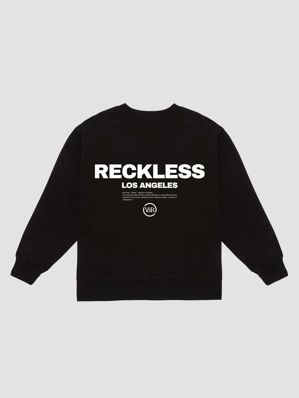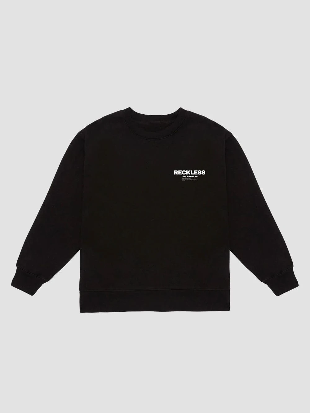- Introducing your new go-to crewneck! Black crewneck features our Standard Reckless logo on the front, and the same larger logo across the back. Rib-knit banding at the cuffs and hem provides a snug and secure fit. Wear with a pair of our signature denim jeans or sweatpants to complete the look!