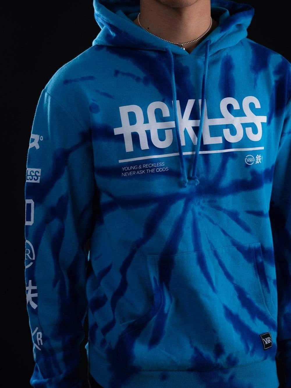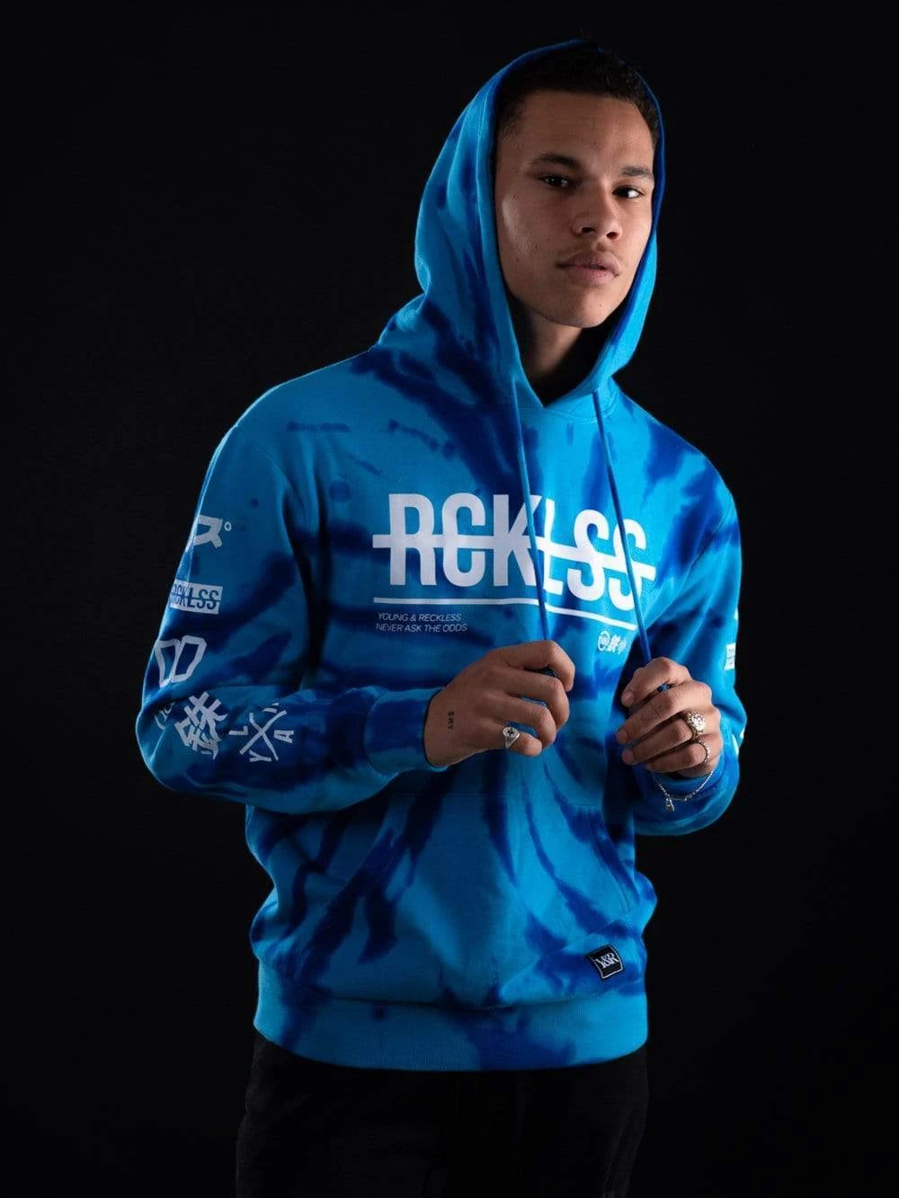 - Shop that new new from Young and Reckless! Blue tie dye hoodie features our Strike Thru RCKLSS logo across front, graphics down both sleeves, and a large graphic on the back. Rib-knit banding at the cuffs and hem provides a snug and secure fit. Hoodie is also equipped with an adjustable hood and a large front pocket.