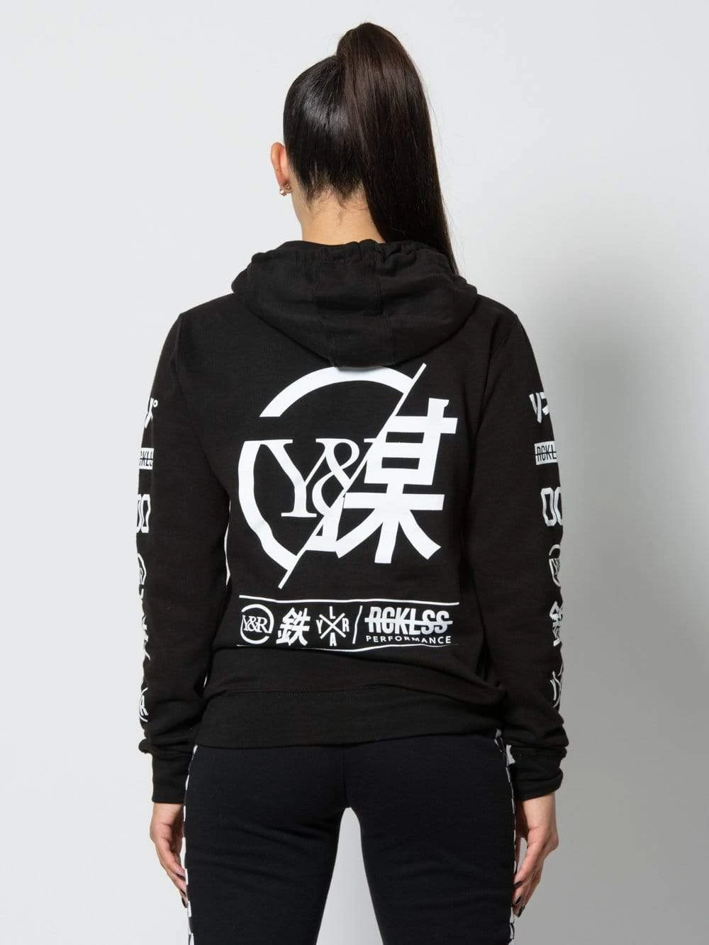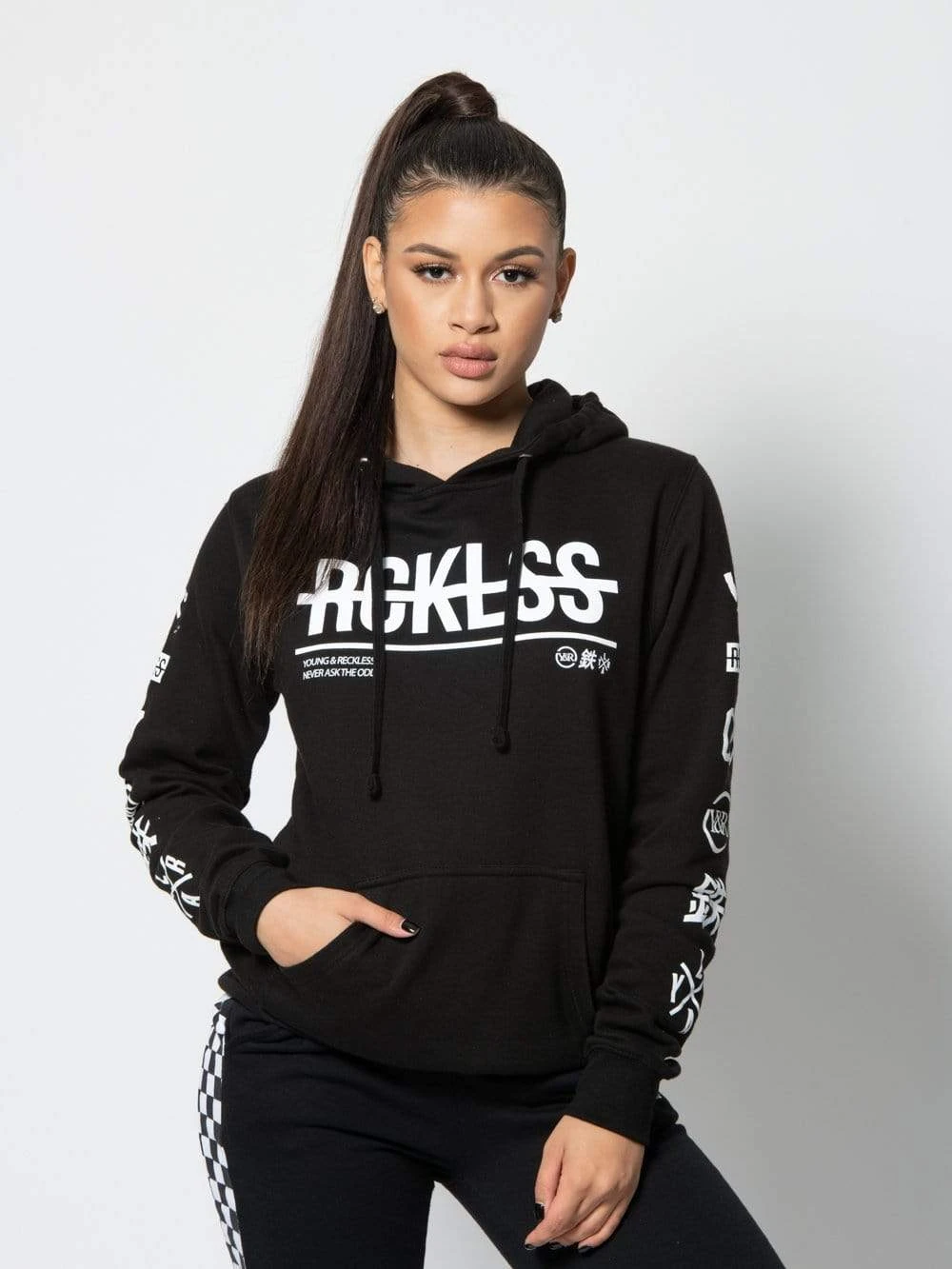 - Stay warm any time of year in one of our signature Young and Reckless hoodies. Black color comes with white strike thru font and graphics on the front, back, and sleeves. Rib knit banding at the cuffs and hem provides a snug and secure fit. Laced with an adjustable hood and a large front pocket.