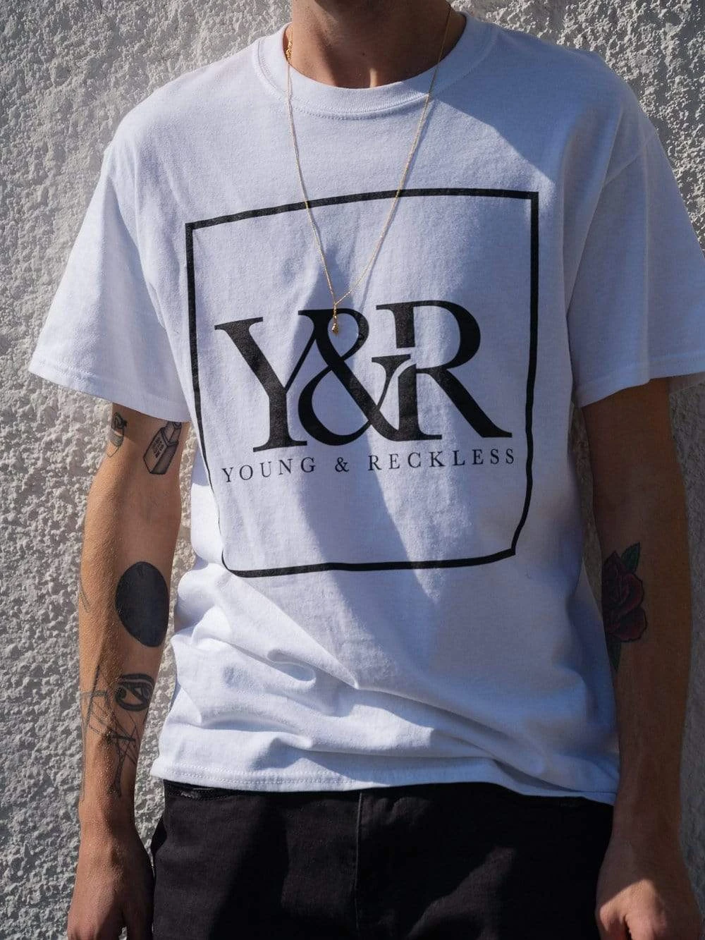 - Make a statement with one of our favorite Young & Reckless graphic tees. White tee is short sleeved, cut to a standard fit, and topped with a rib-knit crew neck. Tee features our classic Trademark Box logo front and center. Pair with one of our signature jeans or sweatpants to be bold and comfortable at the same damn time.