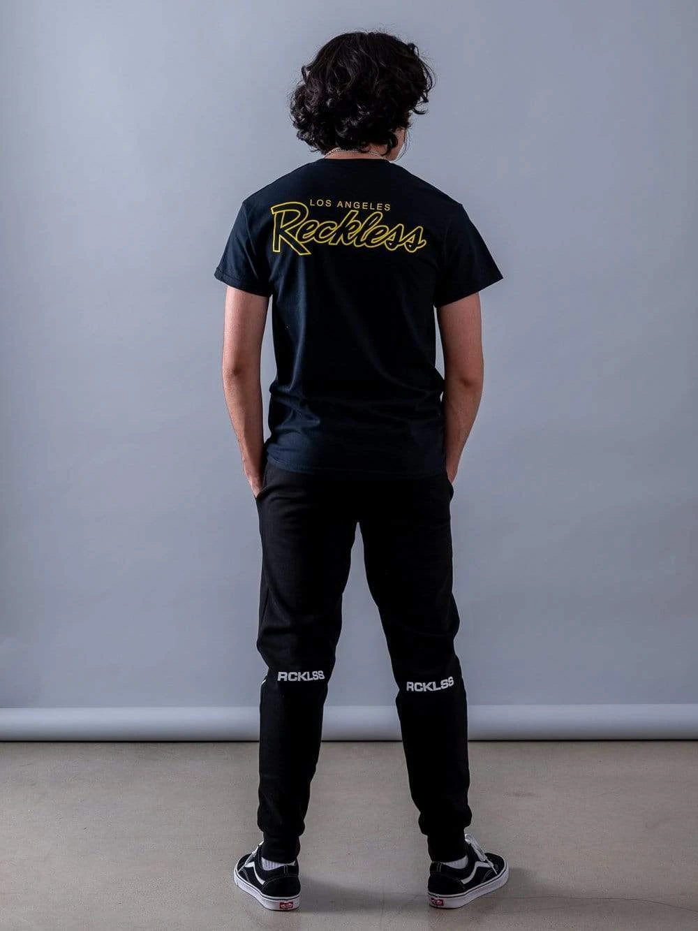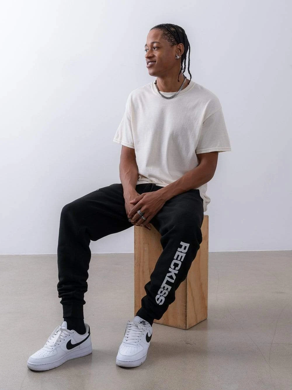 - Introducing our new Trespass Sweatpants! All-black color is finished with RECKLESS logos on the front and back pant legs. Athletic silhouette comes with rib-knit banding at the hem,