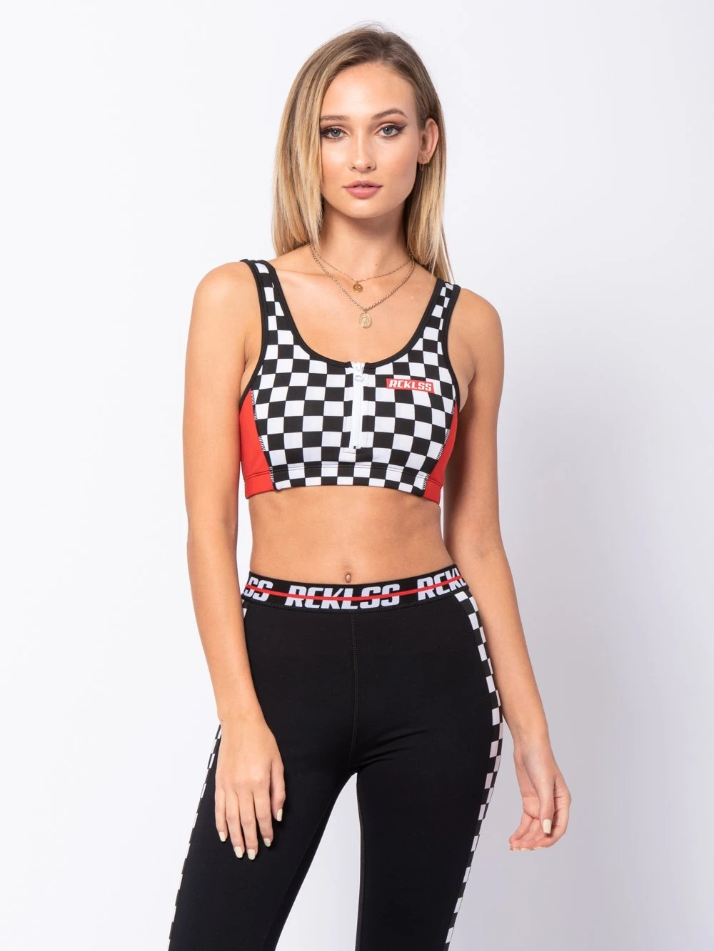 - Keep the crowd in check when you hit the gym in one of our signature Reckless Girls sports bras. V-neck silhouette comes with thick branded bust band for enhanced support. Zip-front closure provides moderate coverage and enhanced breathability. Reckless logo at the left will have you sweating in swag.